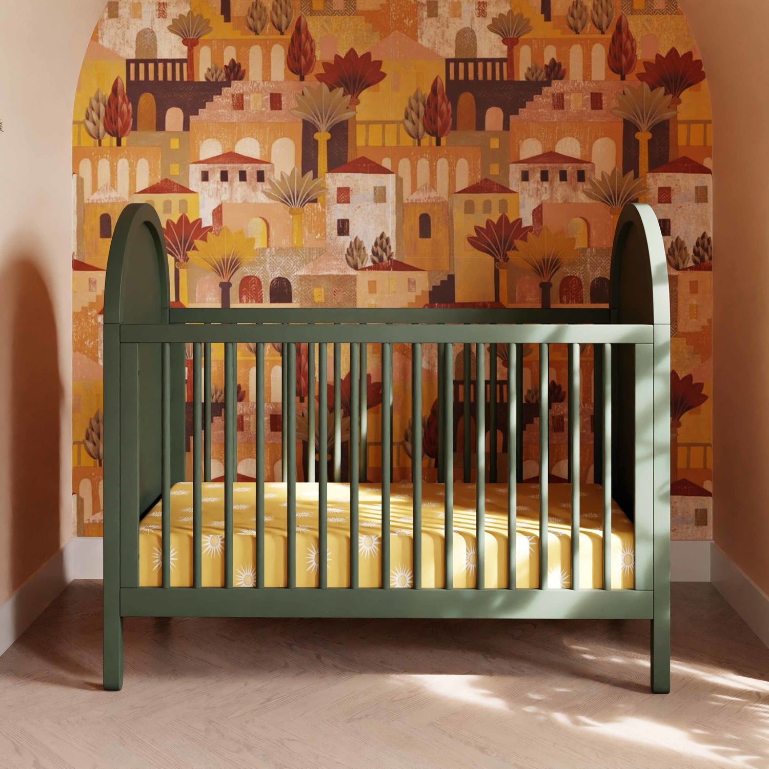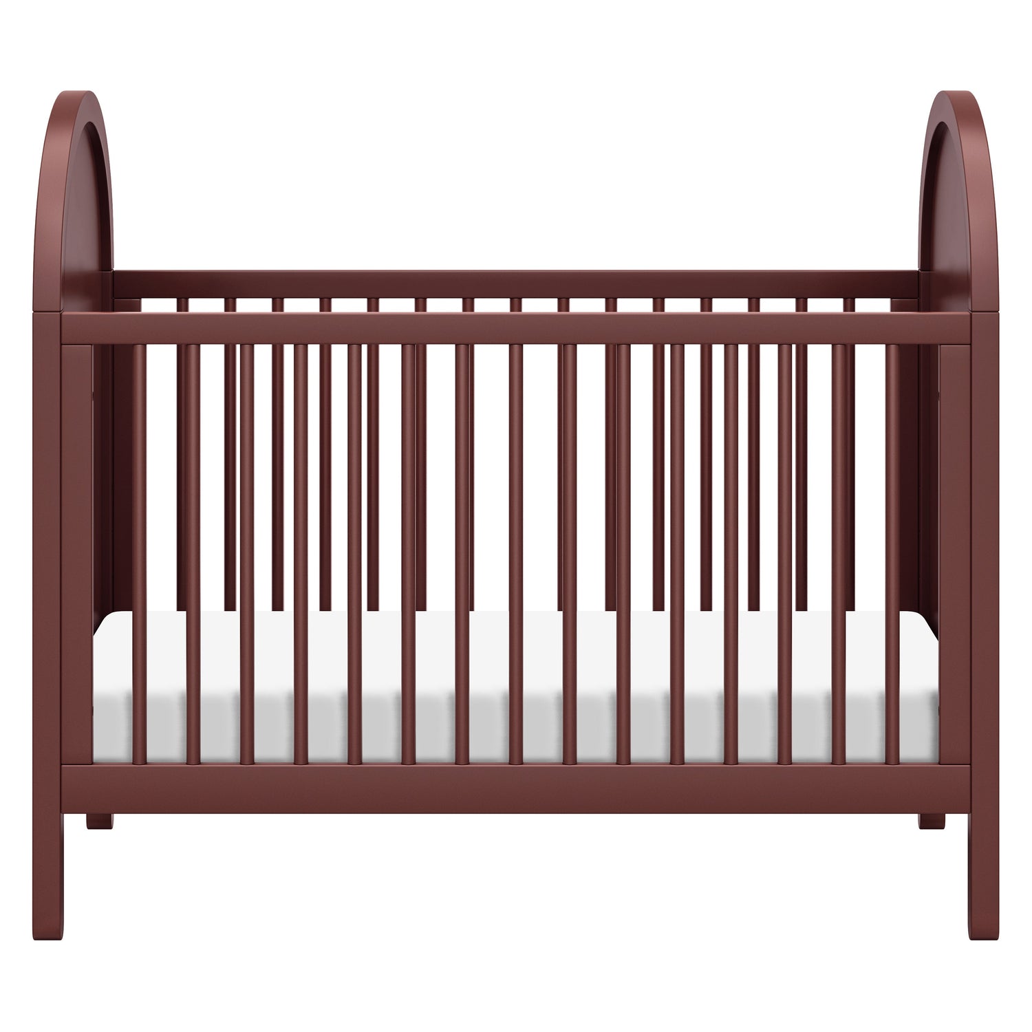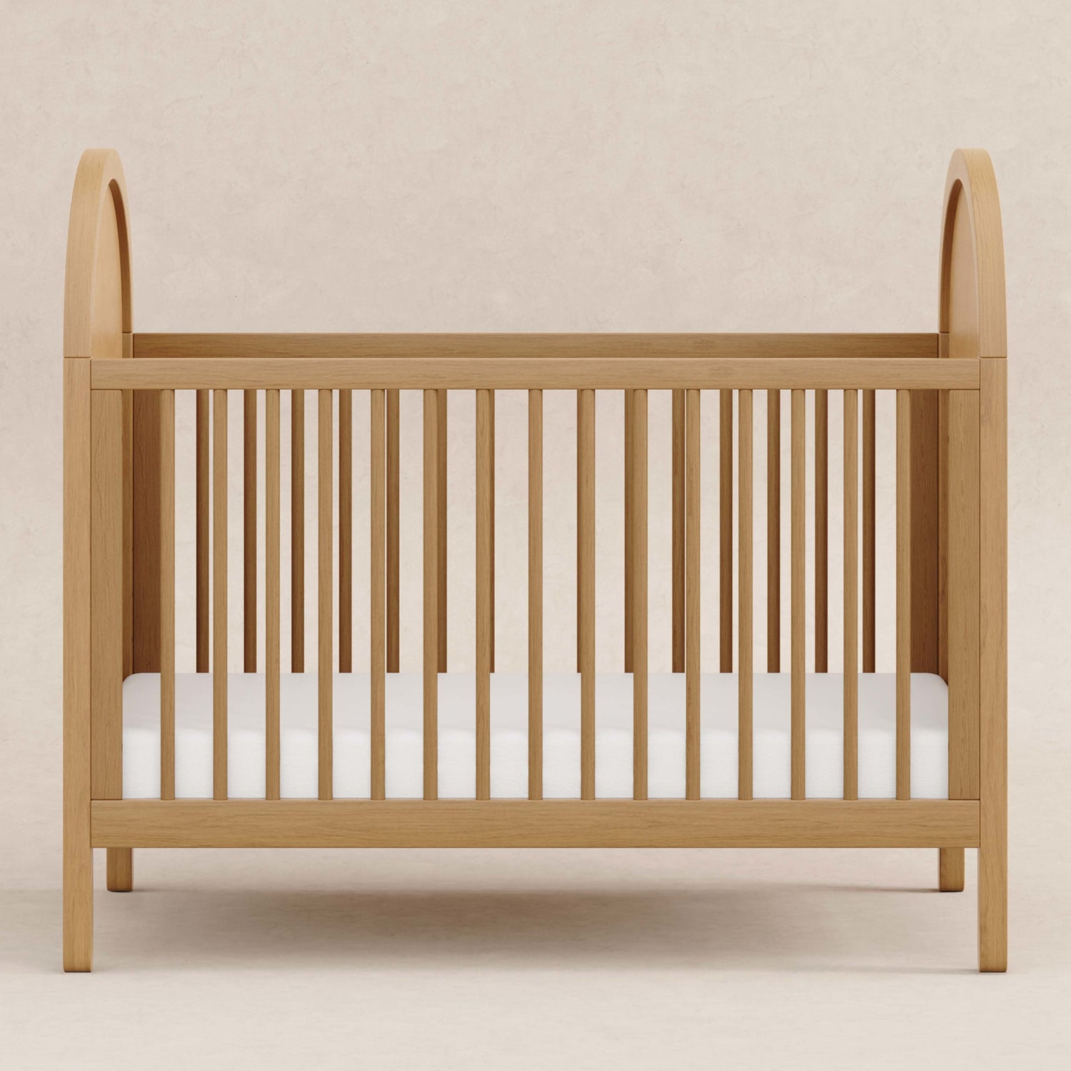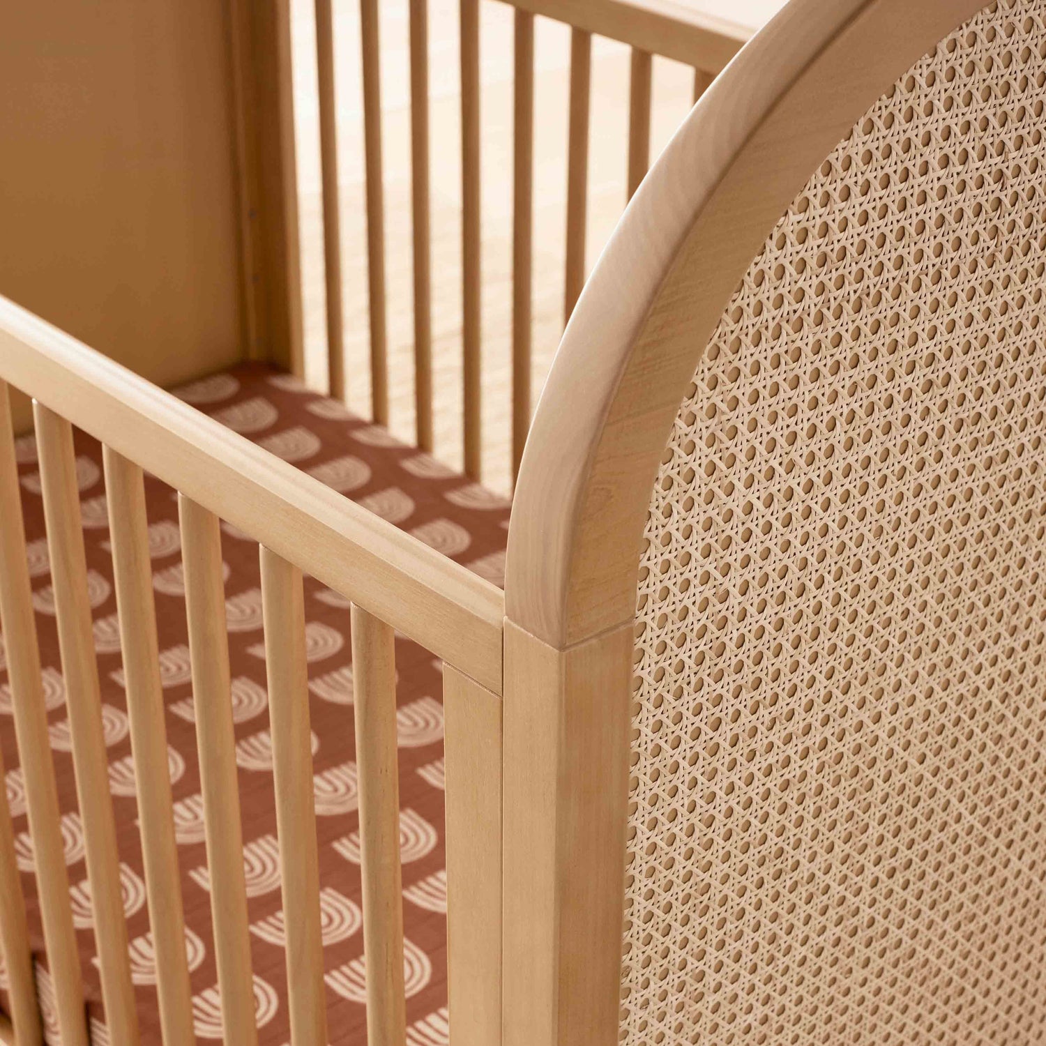 The Bondi Cane 3-in-1 Convertible Crib celebrates boho-inspired design and natural materials with its warm wood tone, playfully arched side panels, curved feet, and woven plant-based cane. The Bondi is designed to grow with your babe using an included toddler bed conversion rail and is screened for harmful chemical emissions to ensure it meets GREENGUARD GOLD Certification.