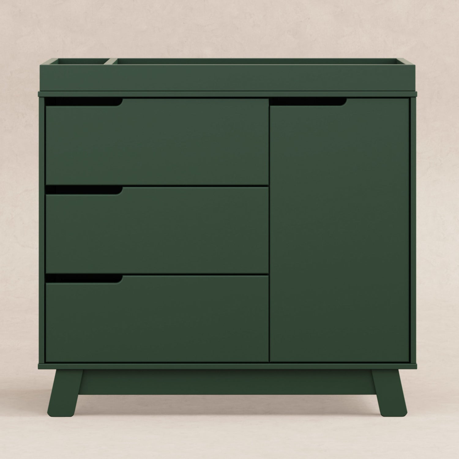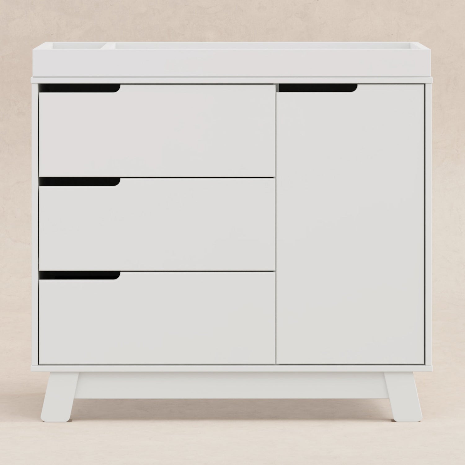 Get more from your nursery furniture with the versatile Hudson Changer Dresser. Combining a changing table, three drawer dresser, and storage cabinet all in one solid and practical package, the Hudson Changer Dresser is a modern space-saving convenience. Complementing the mid-century modern-inspired Hudson 3-in-1 Convertible Crib, the dresser comes in three chic finishes including two new takes on two-tone for the nursery. Truly built for baby, the removable changer tray's raised sides help keep your little one safe, and an anti-tip kit is included for further security. Keep baby's clothes and necessities organized in the smooth-opening drawers, while stop mechanisms prevent them from being pulled all of the way out. The storage cabinet closes gently and includes an adjustable shelf, perfect for keeping diapers and wipes handy.