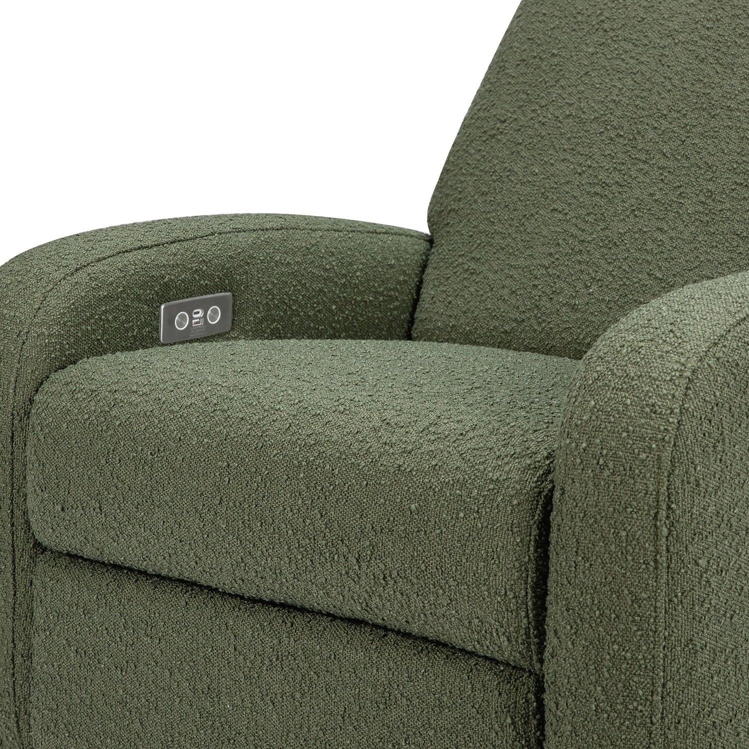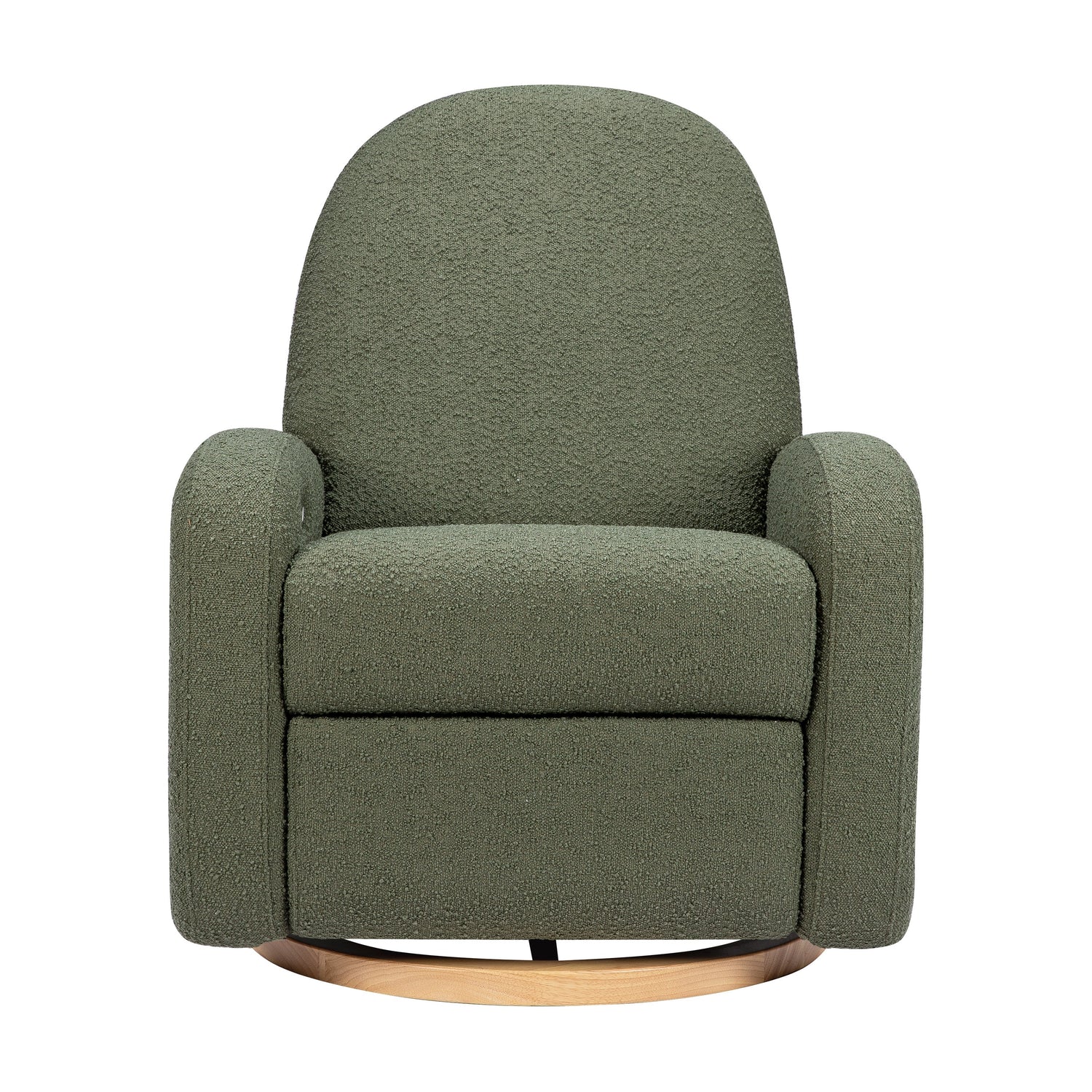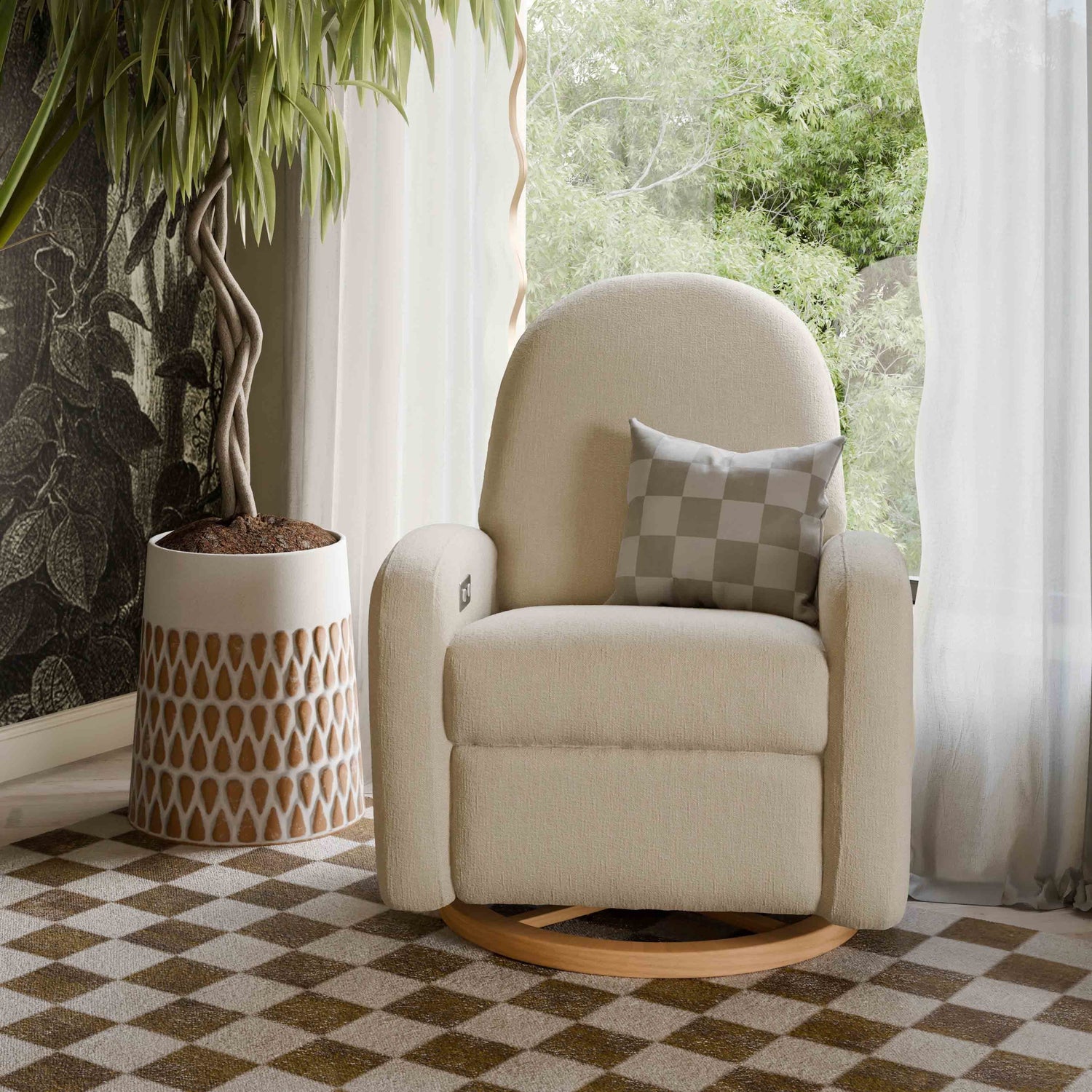 The Nami Glider Recliner is an elevated nursery accent piece thatѓ??s both playful and comfortable with its round and friendly silhouette. The oversized, organic proportions, coupled with its natural wood base, fit into a soft and modern palette. Rest and recharge in this recliner with its built-in USB port, smooth swivel motion, and effortless back and forth gliding. Lean back and relax at the touch of a button with this recliner's quiet electronic control button. Pair with Naka or Enoki Storage Ottoman to complete the look.