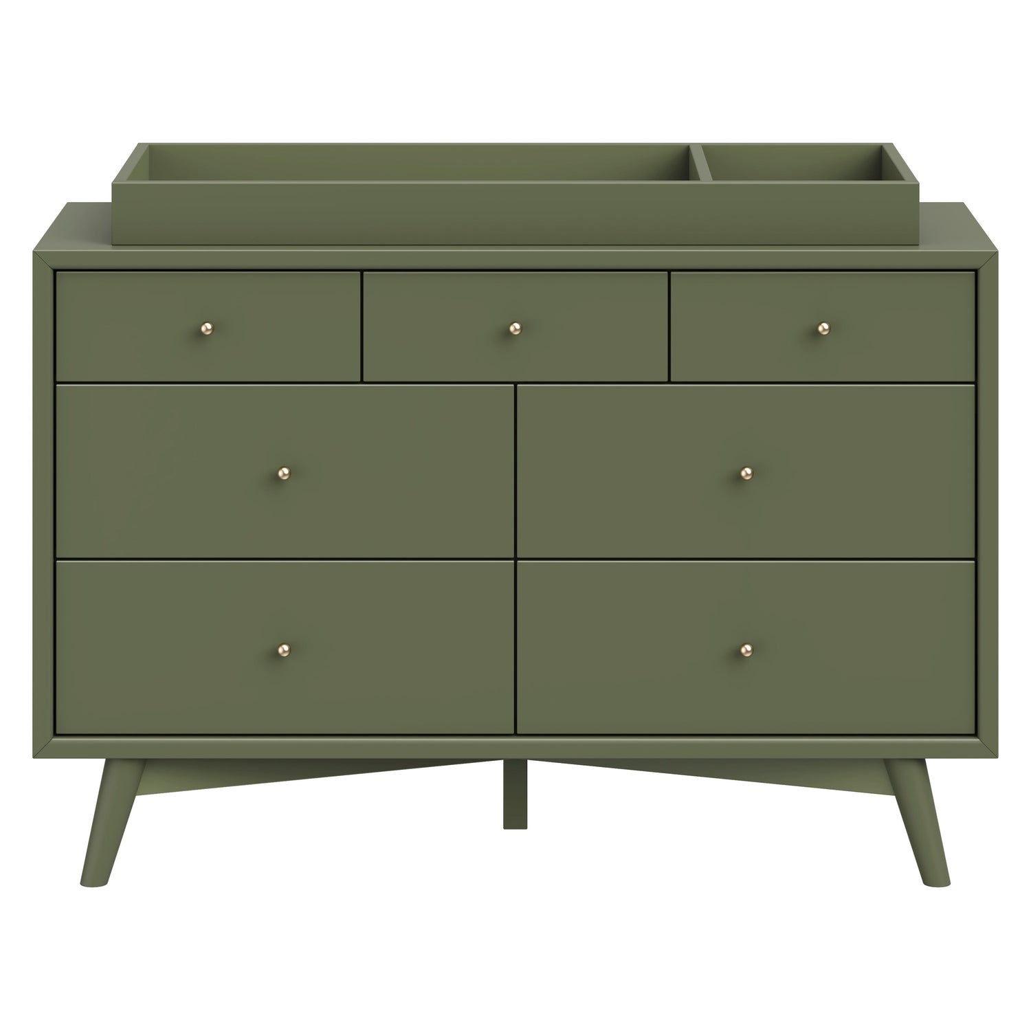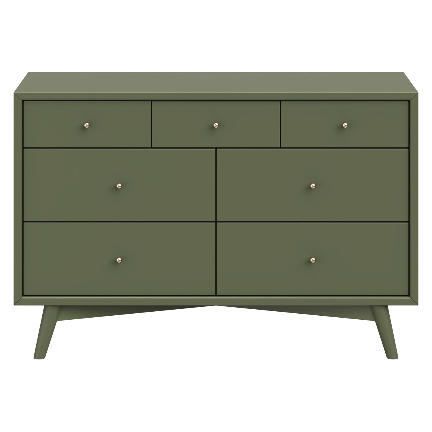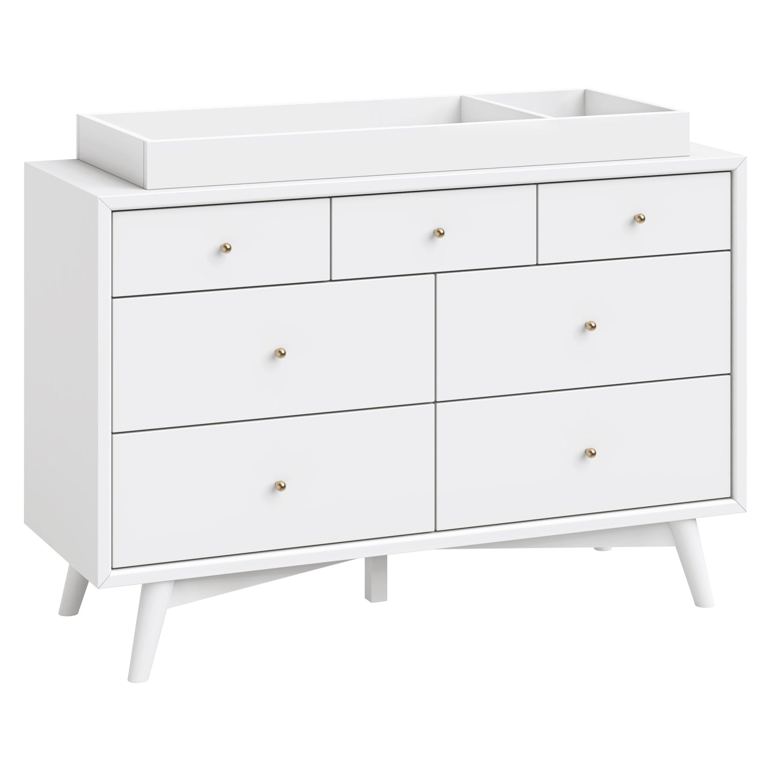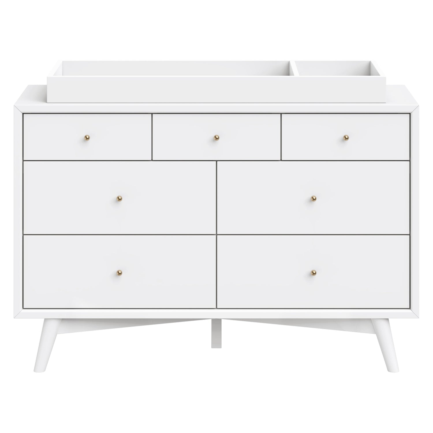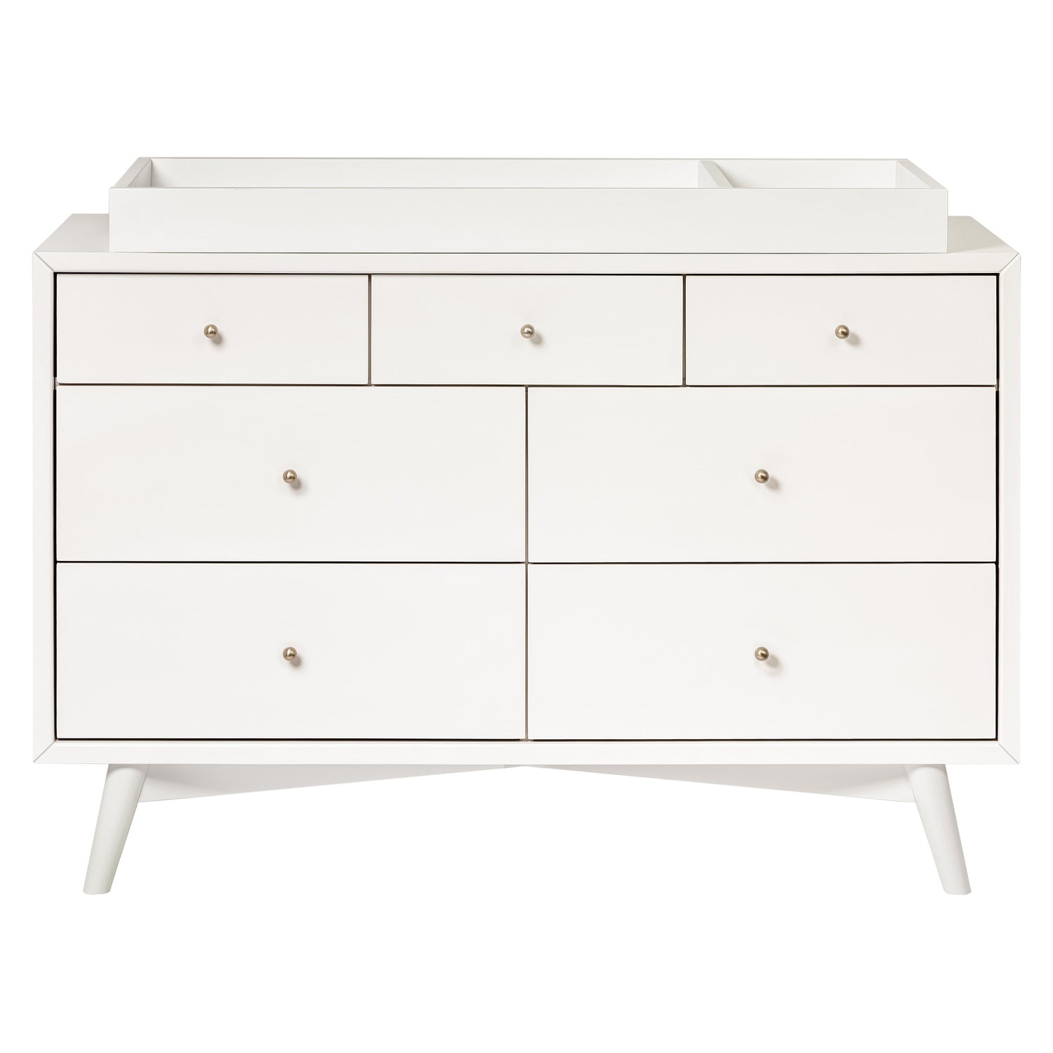The Palma 7-drawer Double Dresser is a sophisticated mid-century inspired design with contrasting walnut stained drawers, tapered legs, brushed metal hardware, and smooth-glide drawers. It's a versatile modern piece, providing ample storage space with three top drawers and four larger bottom drawers. Pair with the Palma 4-in-1 Crib or Peggy 3-in-1 Crib for an elegant nursery.
