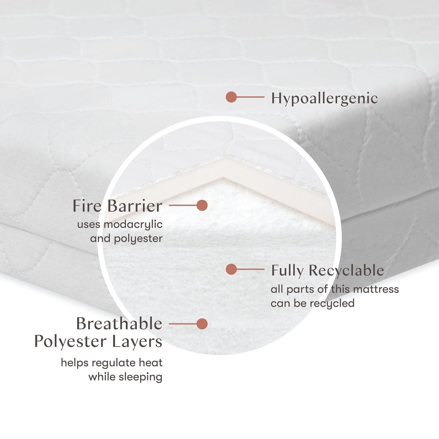 Non-toxic mini crib mattress made with lightweight, fully recyclable polyester coreIncludes multifunctional cover with a soft quilted cotton face and vinyl-free waterproof backing to protect mattress against accidents. Removable, machine washable cover. Mini Crib Size: made for mini cribs (37.625” x 23.5")Hypoallergenic: dust mite and allergen resistantNo chemical flame retardantsSquare corner design with inverted seams for a seamless sheet fitMattress: Outer layer: Cotton/Polyester; Batting: 80% Modacrylic Batting, 20% Polyester Fiber; Inner: Polyester (PET); Cover: Face: Organic Cotton; Filling: Polyester; Back: Cotton; Band: ElasticCover: Face: 100% Organic Cotton; Filling: Polyester; Backing: Food-Grade polyethylene