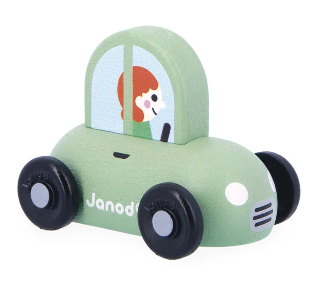 "Off to the supermarket!" This little wooden car is suitable for children aged 12 months and over. In its pretty green color, it's a compact sedan, ideal for getting around town without a hitch! Its shape has been specially designed for little hands, who can easily hold it by the top to drive it around. The vehicles are perfect for inventing stories and developing imagination! Babies first have fun rolling them around, then older children tell all kinds of adventures, developing their vocabulary and creativity. This little Janod car is part of our Cross Roads collection: a series of playmats with circuits, made even more fun when complemented by our cube sets and small wooden vehicles. The green car is particularly suited to the City playmat, but can also be combined with other mats in the range. It's made from FSC™-certified wood from sustainably managed forests. "How about a trip to the florist next?"