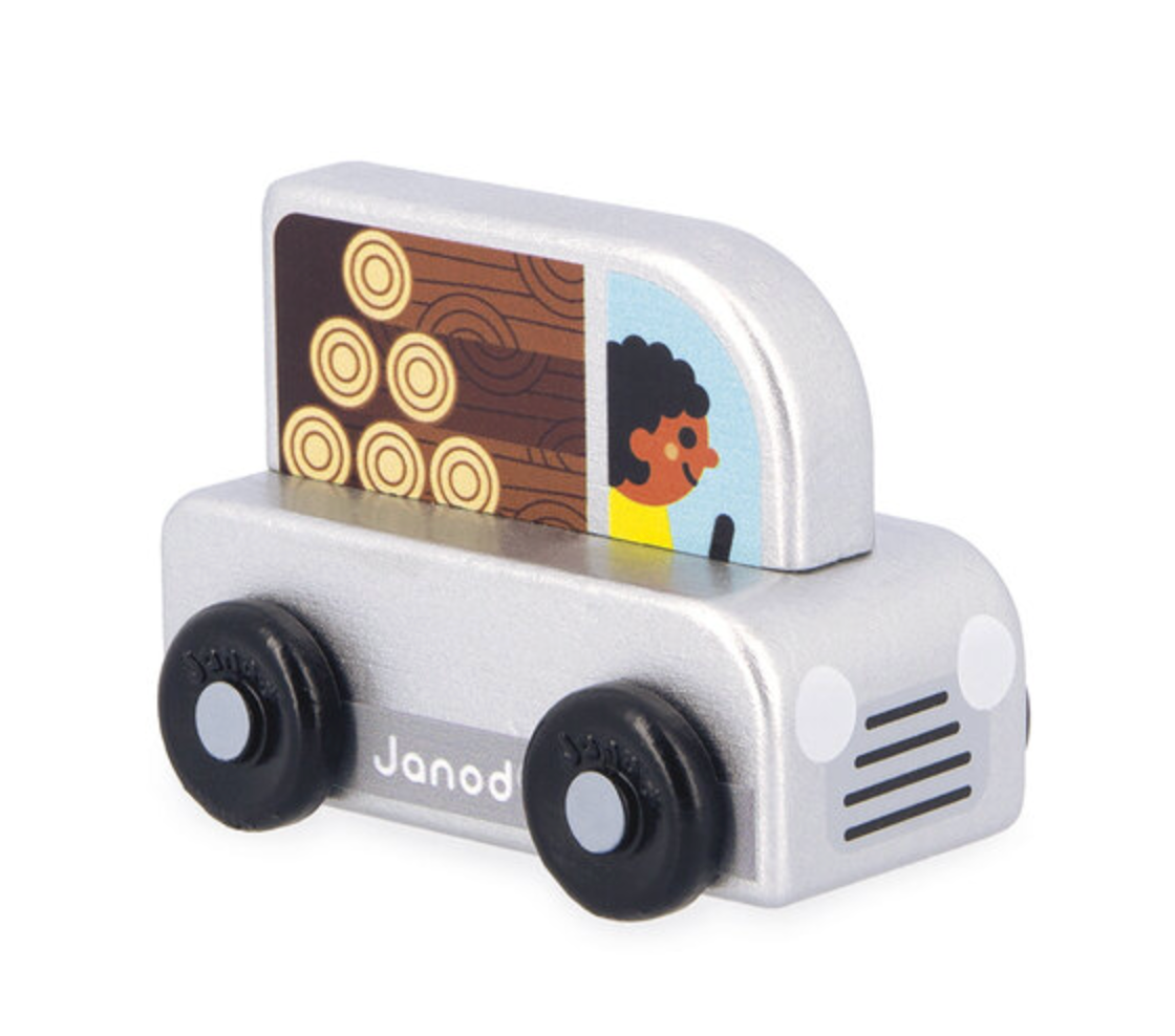 ‘That's a lot of logs to carry!’ This little wooden car is suitable for children aged 12 months and up. With his grey pick-up truck, the lumberjack is heading home with a trailer full of wood! The shape is specially designed for the little ones, who can easily hold the car by the top to drive it around. The vehicles are perfect for making up stories and developing the imagination! Babies love rolling them around, while older children can invent all kinds of adventures, developing their vocabulary and creativity. This little car from Janod is part of the Cross Roads collection: a series of play mats with circuits, which are even more fun when combined with the cube sets and small wooden vehicles. The pick-up truck goes particularly well with the Countryside play mat, but can also be combined with other mats from the range. It is made from FSC™-certified wood from sustainably managed forests. ‘Let's go to the forest!’