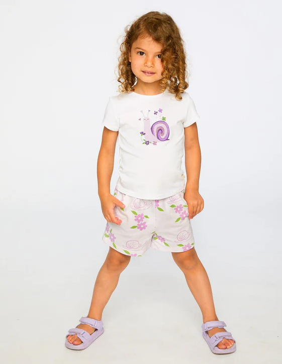 Simple and sweet, this organic cotton jersey t-shirt in white is perfect for everyday wear. Featuring a charming snail print surrounded by delicate clovers and flowers, a round neckline and short sleeves, this tee combines softness, stretch, and playful style. Pair it effortlessly with other whimsical pieces from our "Clovers And Violets" collection.