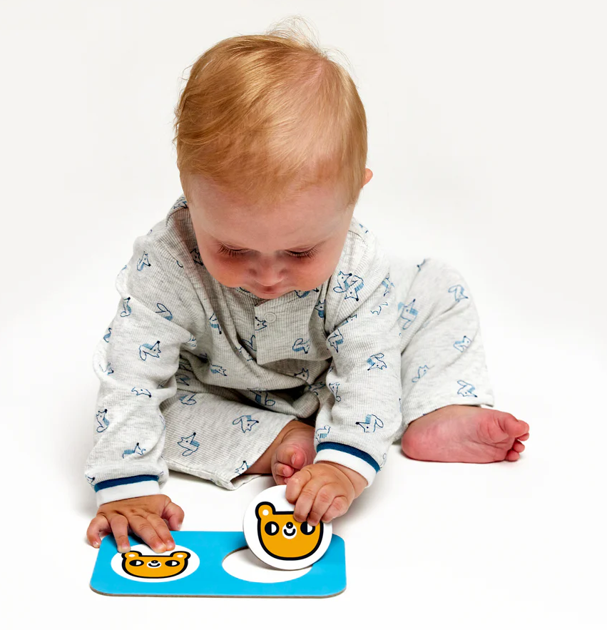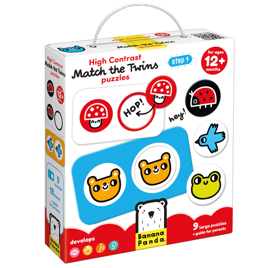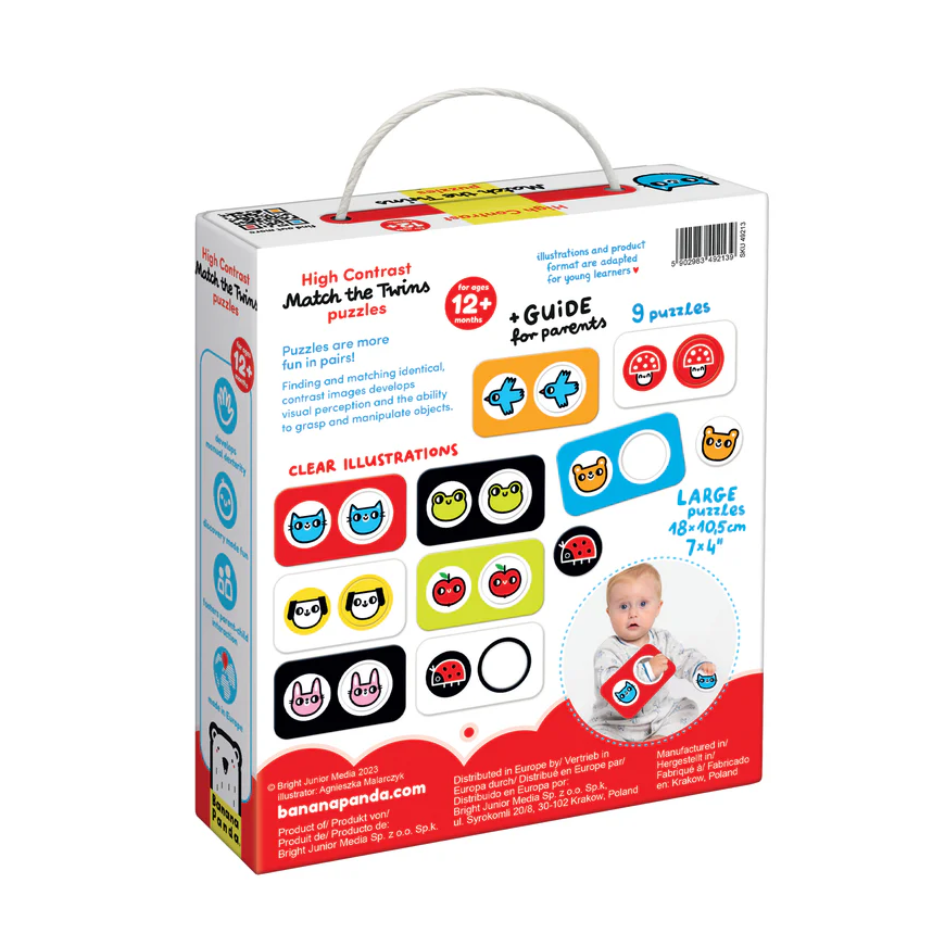Large contrast puzzles with clear, charming illustrations inspire lots of games that support the cognitive, motor and emotional development of the baby’s world. Thanks to this set, twelve-month-olds can learn about the world and develop perceptiveness and concentration in a fun way. The set includes a guide full of ideas for playing with these simple puzzles.