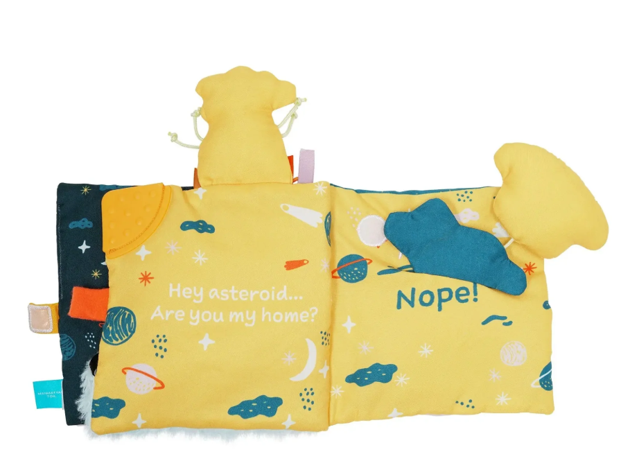 Follow along with this charming story of a rocket on its search for its home. Soft book features include various fabrics and textures, embroidered art, squeaker, rattle, and a plastic teething corner. Whimsical space-themed characters appear on every page. Encourages parent-child bonding and language development while fostering cause-and-effect learning.