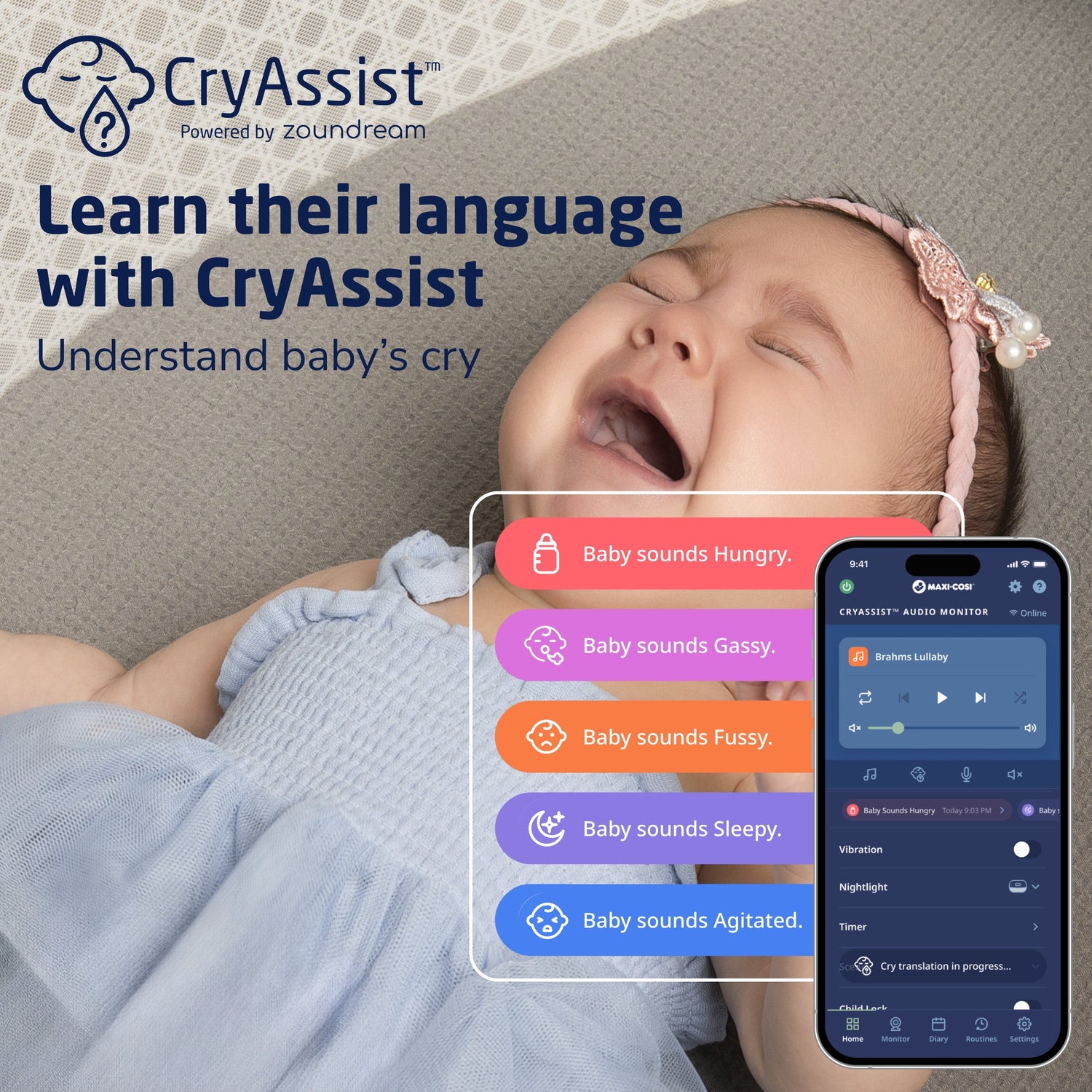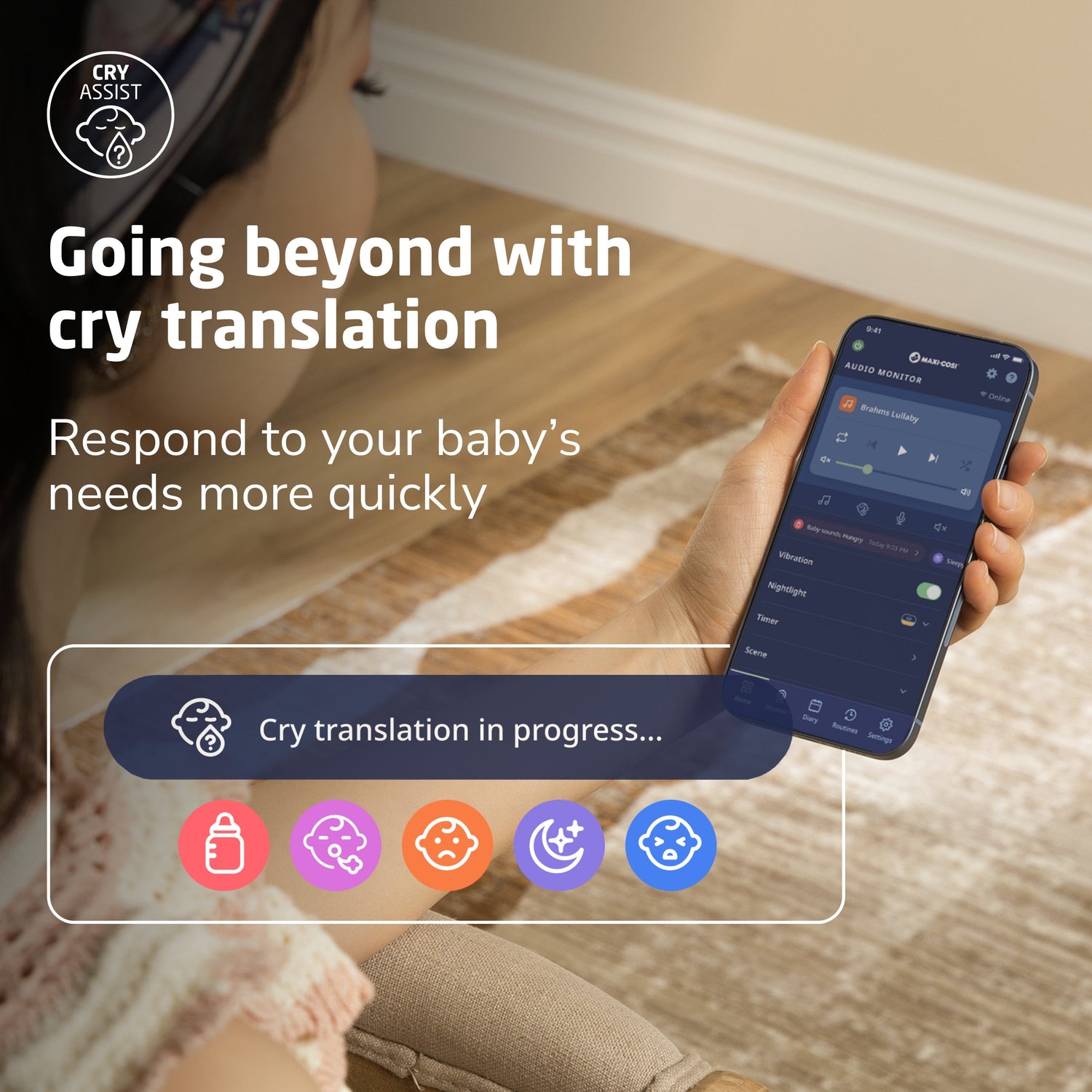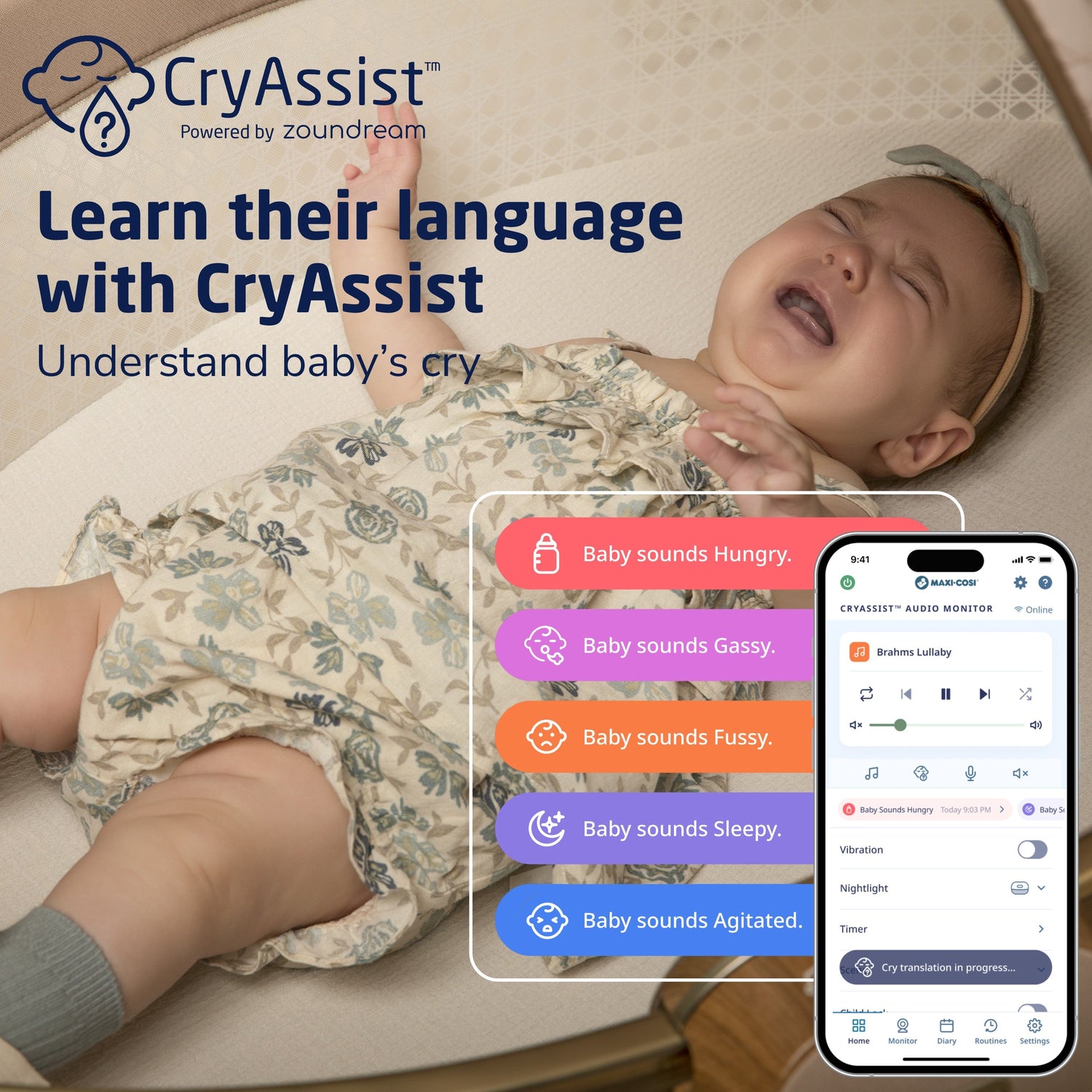 - Includes the Maxi-Cosi CryAssist™ Audio Monitor, which translates your little one’s cries and notifies you in the Connected Family app. Also features soothing sound playback, a motion-activated nightlight and gentle vibration