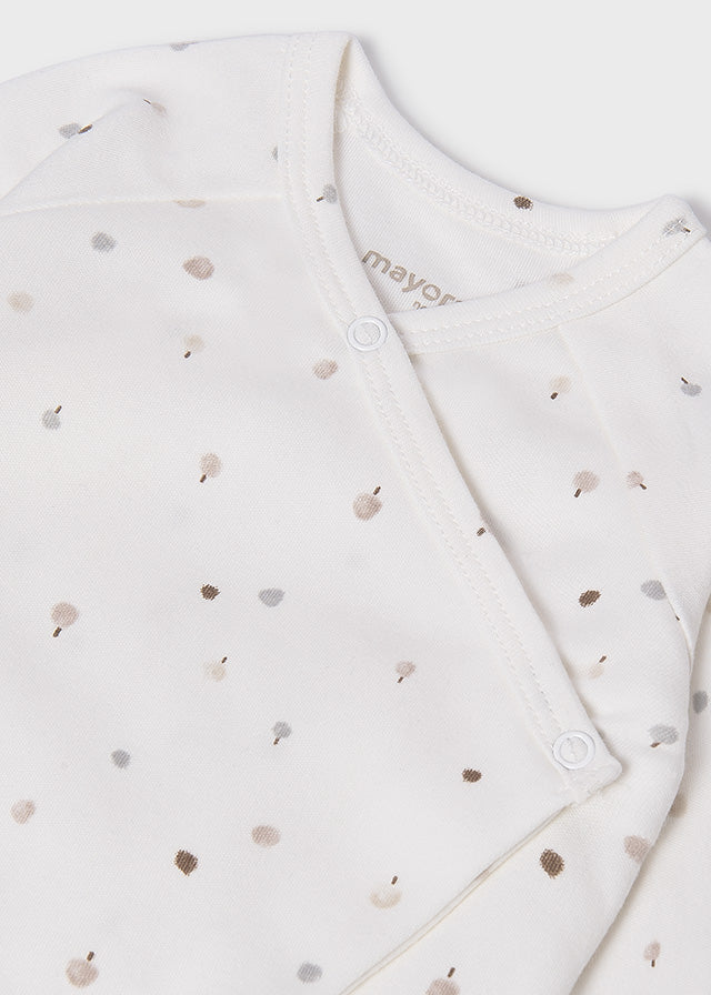 Long sleeved Sleepsuits for baby. Crossover collar and full side slit with press stud fastenings. Snap button fastening at crotch for easy dressing. 100% cotton. Patterned design. The sleeve cuffs of the small sizes of this model (0-0 to 4-6 months) have a mitten effect.