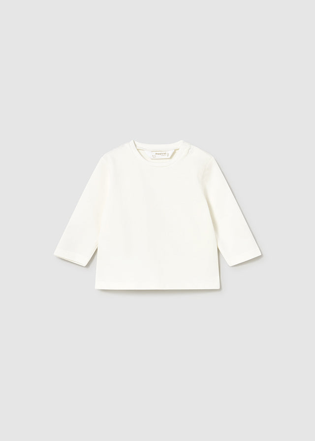 Long sleeved T-shirt for newborn baby boy. Round neckline. Snap button at the collar to make it easier to put the garment on.