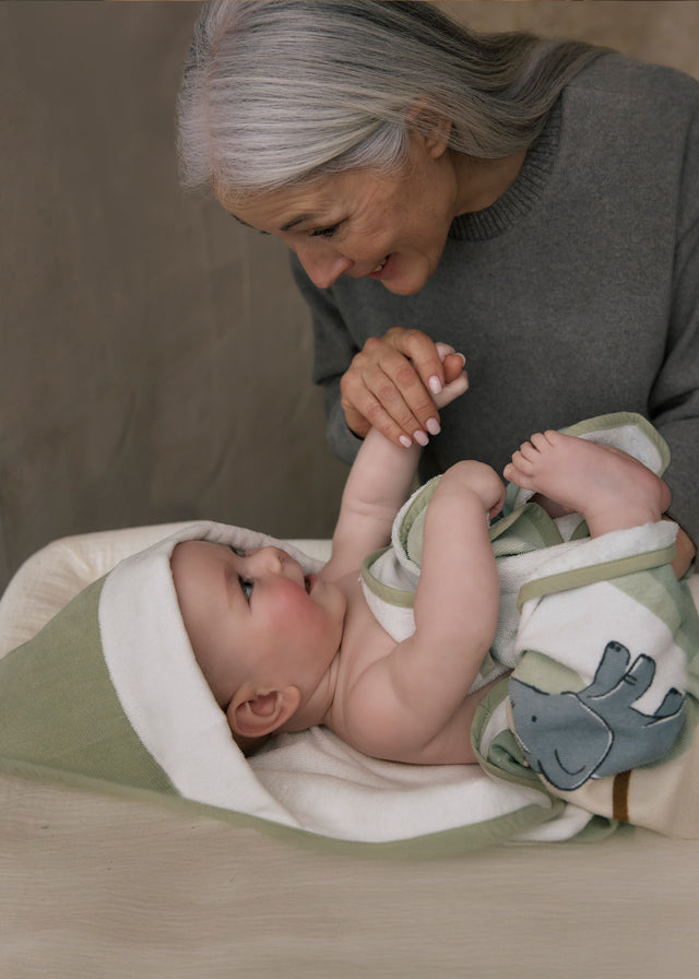 Hooded towel with wraparound design so you can dry and wrap up your baby after a bath/swim. The item has a unisex design which offers great versatility through its neutral color tones and shape.