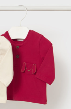 Long sleeved T-shirt for newborn baby boy. Round neckline. Button fastenings down the front. Functional front pocket.