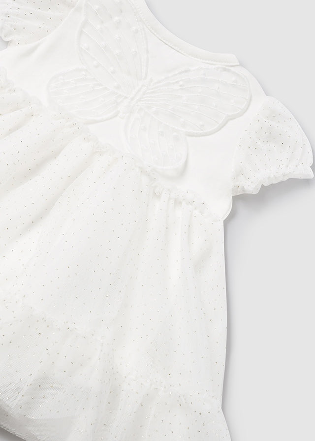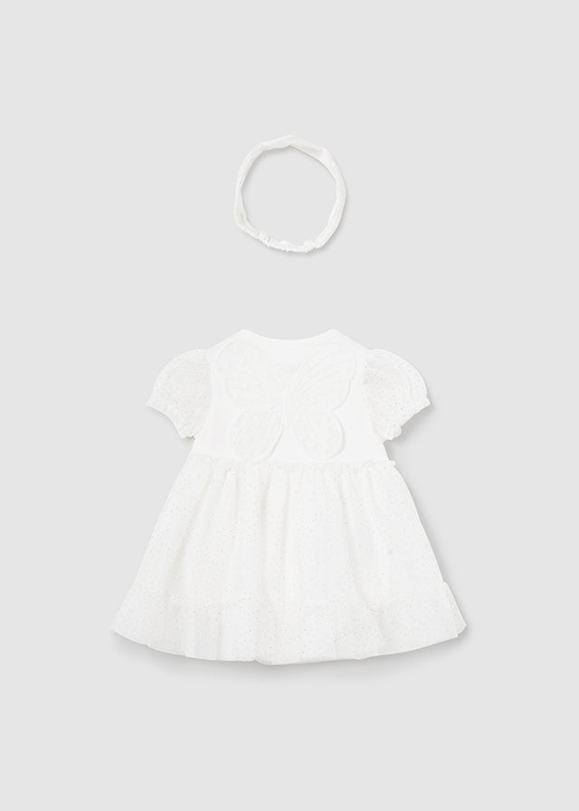 White teacup tulle dress & headband for baby girls from Mayoral. Snap button closure at crotch for easy putting on and taking off. Button fastening on both shoulders. Made with lightweight, sheer tulle fabric. Decorative elements: embroidery.