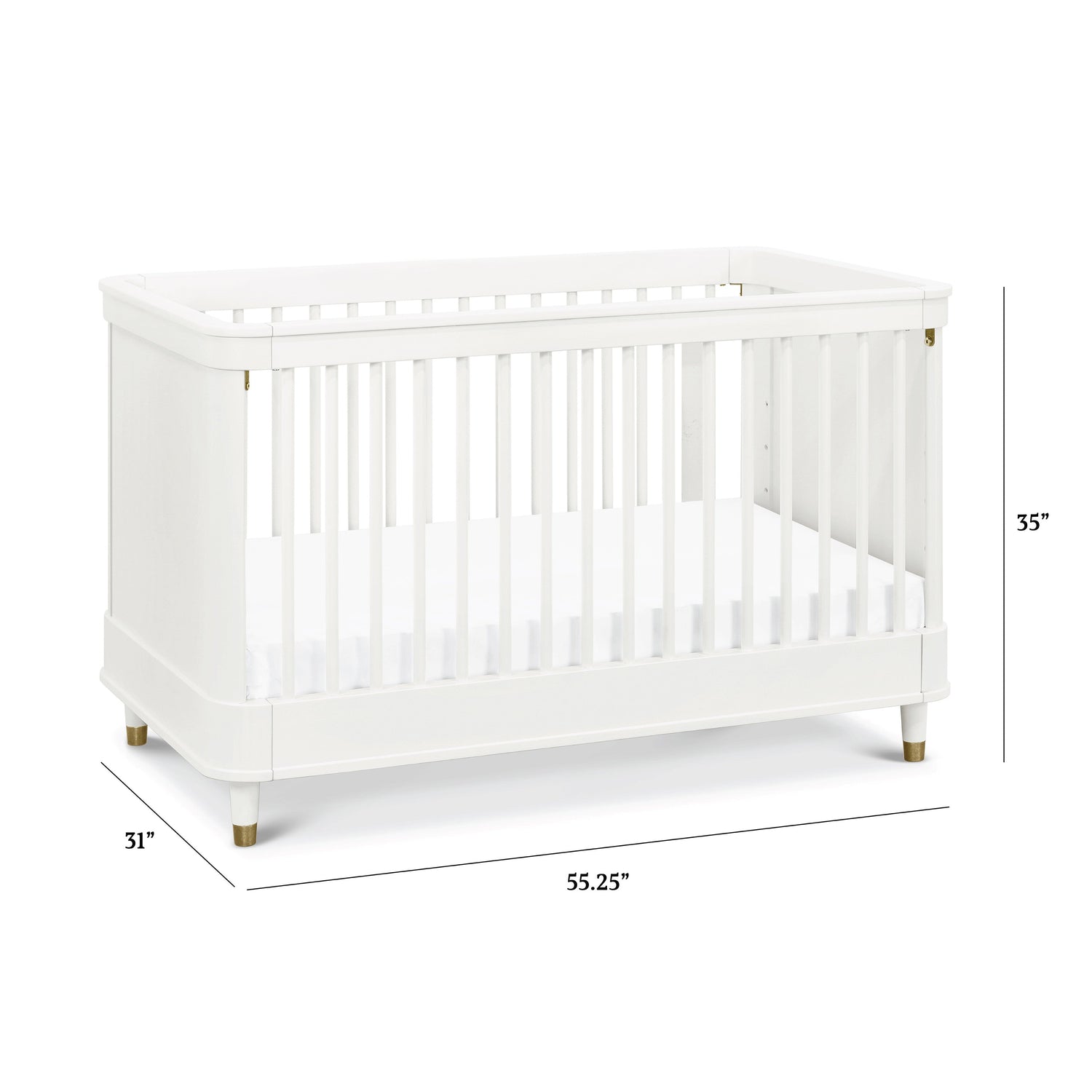 Ease into contemporary style with the Tanner 3-in-1 Crib. Featuring a gently curved silhouette with solid rounded side panels and elegant bronze metal feet accents, the Tanner is an effortlessly transitional piece for the home. Crib converts to a toddler bed and daybed, and fits any standard full-size crib mattress. Available in a Warm White finish.