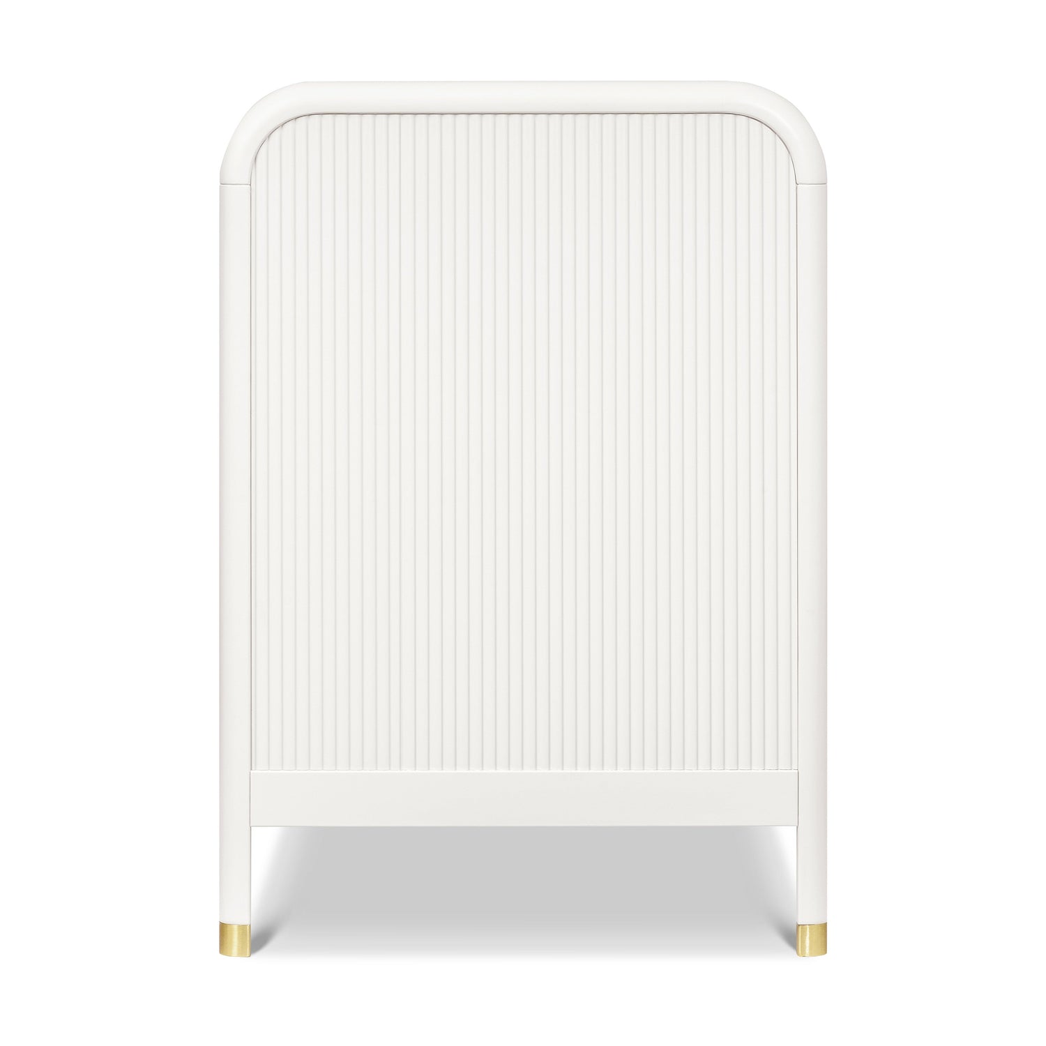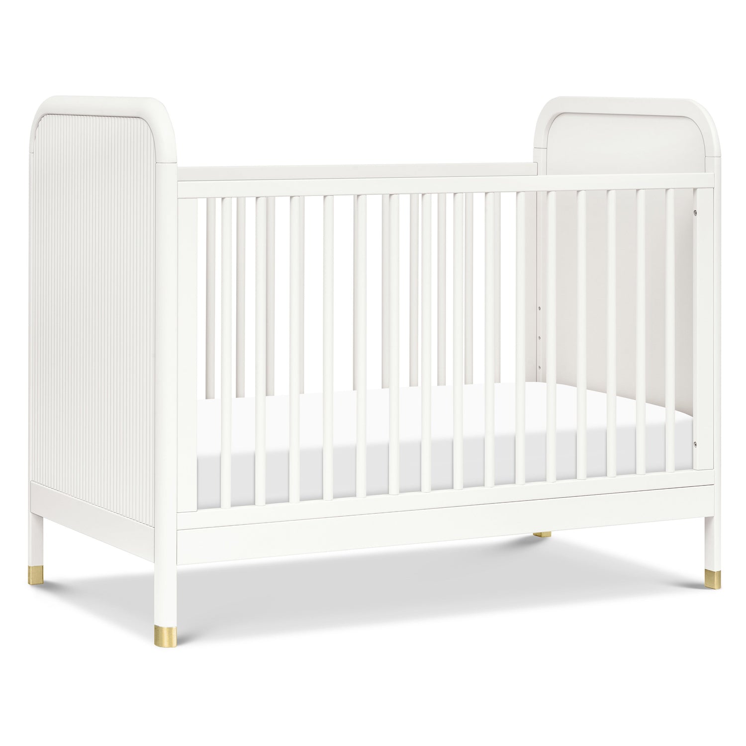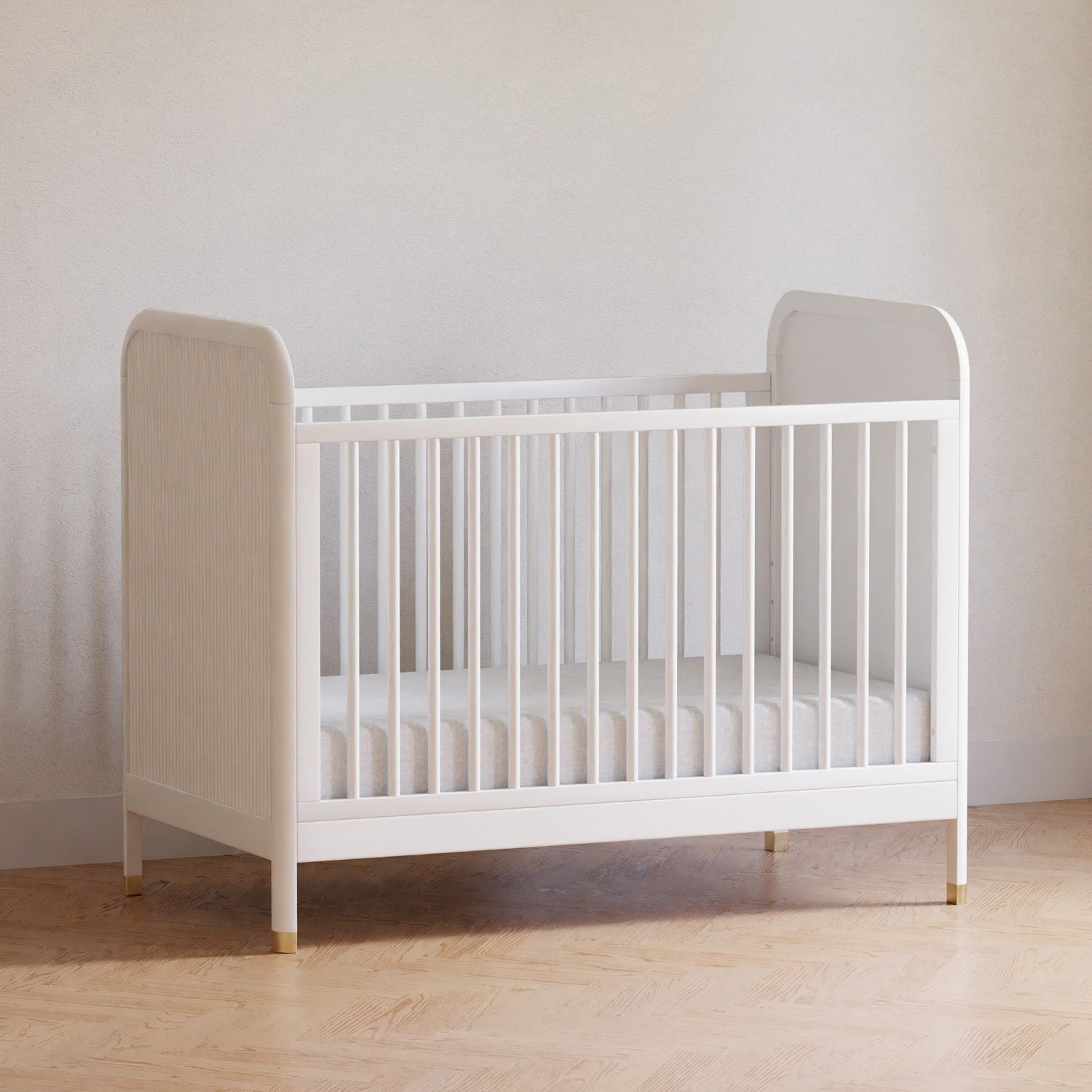 The Brimsley Tambour Crib is a masterpiece of craftsmanship that blends timeless design with modern functionality. Its distinctive tambour design and gently curved slats, paired with elegant gold feet, make this crib more than just a place for your little one to rest; it's a statement piece that elevates the aesthetic of your nursery.