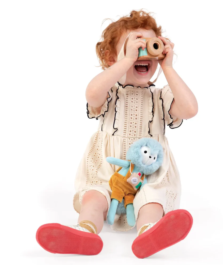 Strike a pose! This four-piece set includes a wooden camera body and attached neck strap with three interchangeable lenses: clear, green and kaleidoscope. Woven fabric strap can open and close so little ones can capture the moment with ease. Fosters imaginative role play, as well as visual, cognitive, and social-emotional development.