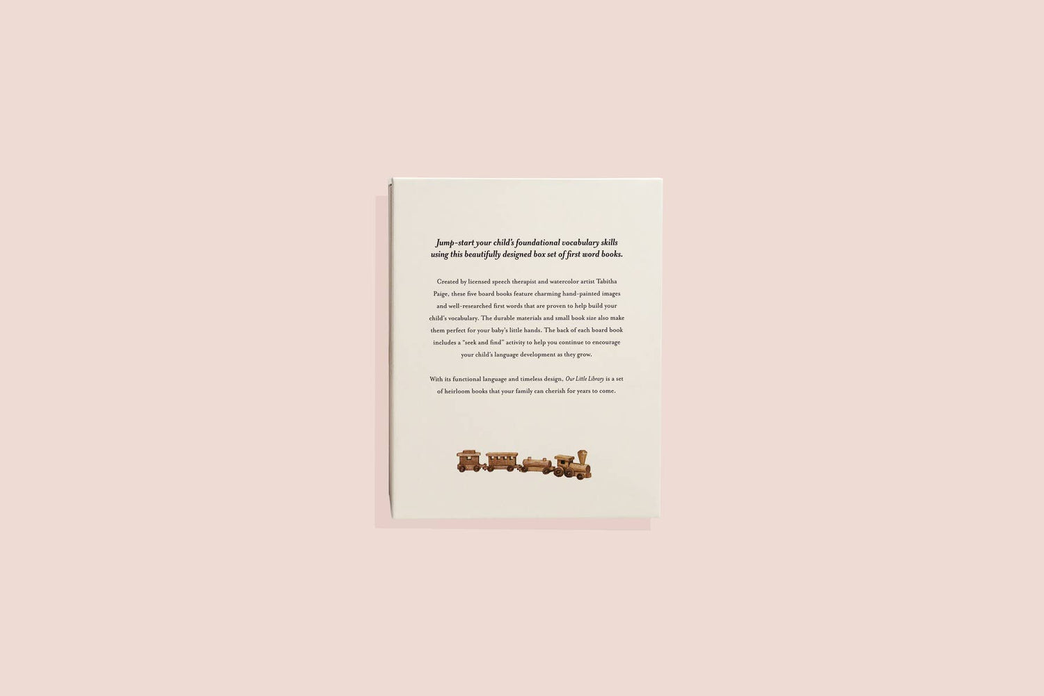 Our Little Library includes five board books that feature charming images and foundational first words that will help you build your child's vocabulary. The durable materials and small book size also make them perfect baby books for your baby's little hands.