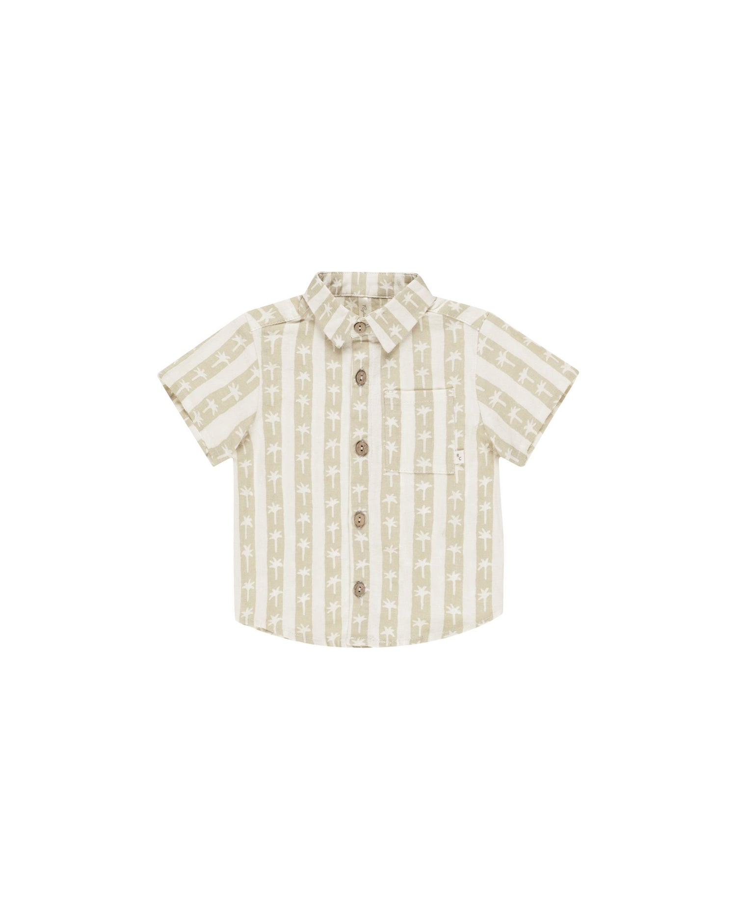 A classic collared boys short sleeve button-down shirt with coconut buttons.