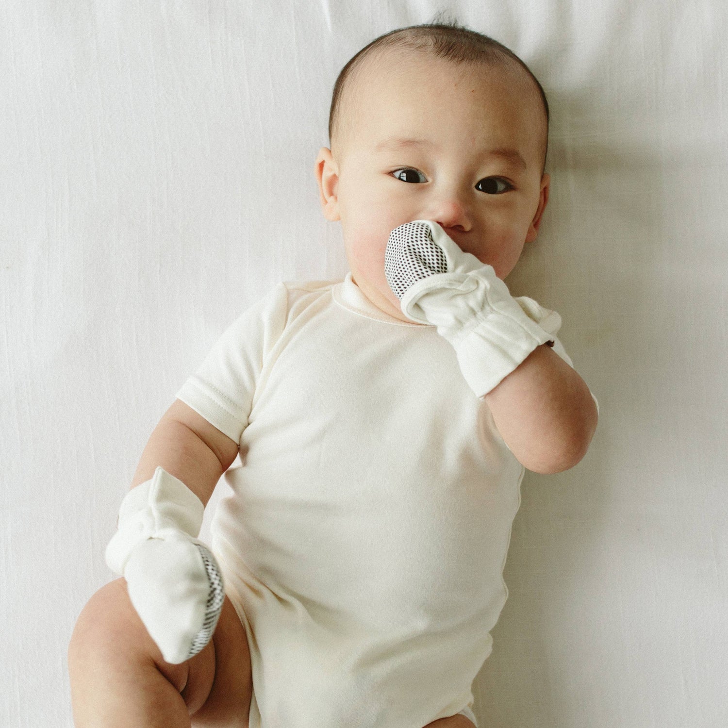Goumi's stay-on baby mitts actually stay on. Our signature two-part closure — thicker elastic plus low-profile Velcro — keeps tiny hands covered all day. This NICU-approved preemie set in CLOUD protects from scratches, keeps hands warm, and features our reversible black & white pattern proven to calm babies and boost brain and eye development. Made from super-soft bamboo viscose & organic cotton.