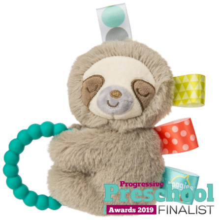 5″ Begin each day with a long, slow hug. In the Baby market, sloths are hot! Molasses is our “cute” version of a realistic sloth. Naturally neutral color palette. Sloth is incredibly soft, with a captivating face, and tags all over. Rattle on the inside and a silicone teether on the outside make this sleepy sloth both stimulating and soothing. Taggies looped ribbons adorn this cutie. Machine wash, air dry.