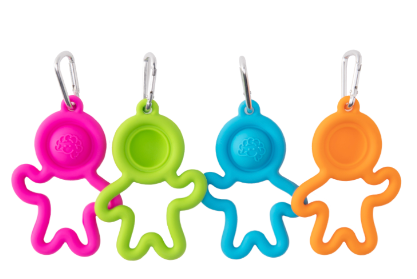 - Silicone, buddy-shaped keychain with dimbl bubble to poke and pop