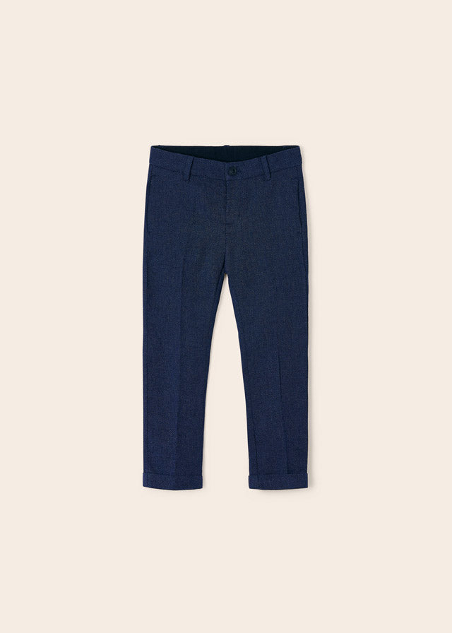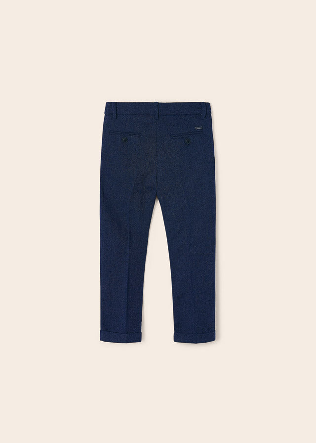 Boy's long straight-cut chino trousers in soft, slightly stretchy fabric. Elasticated waistband with adjustable drawstring. Knees reinforced on the inside, specially designed to provide greater resistance in the area of most wear and tear.